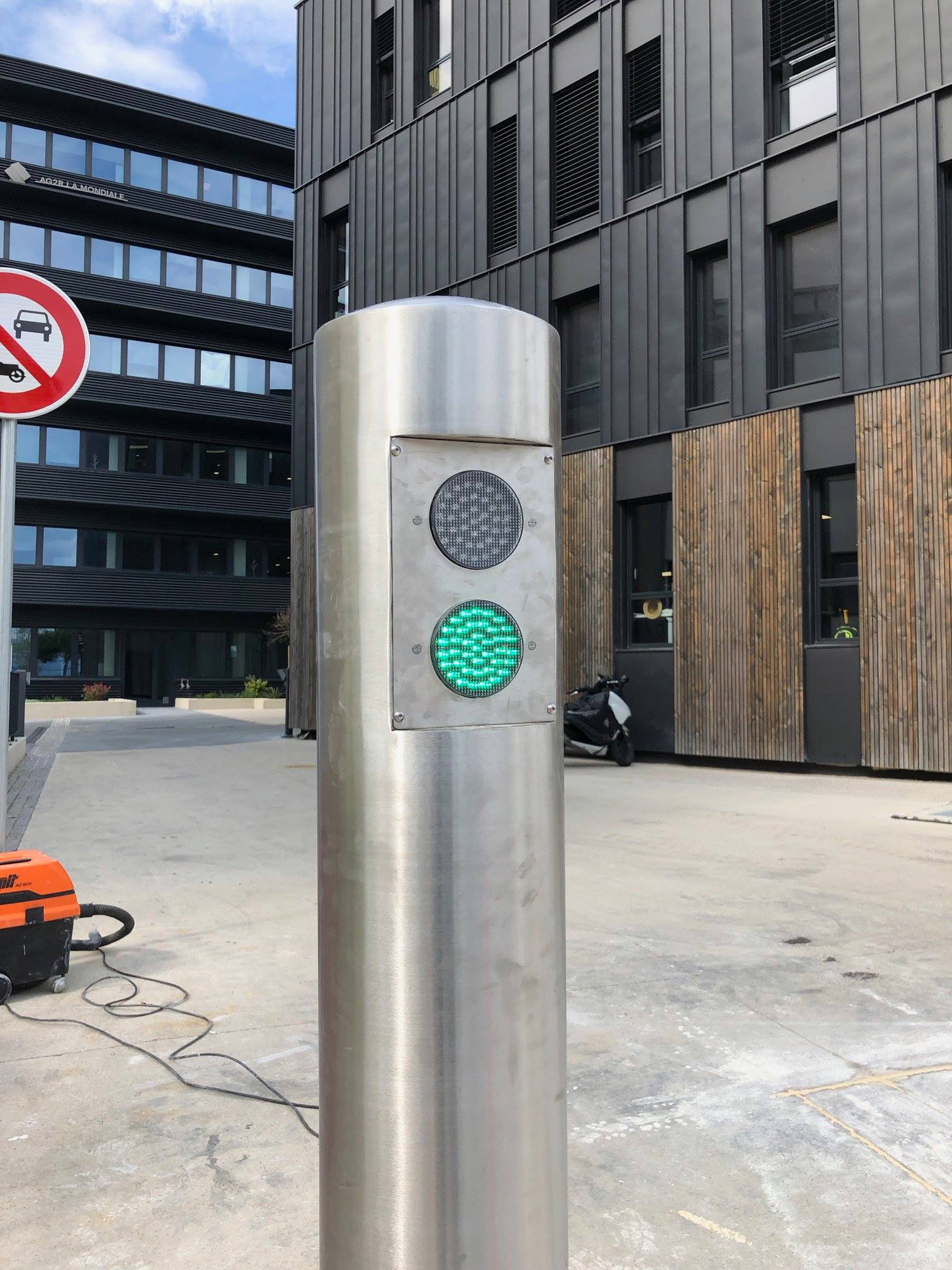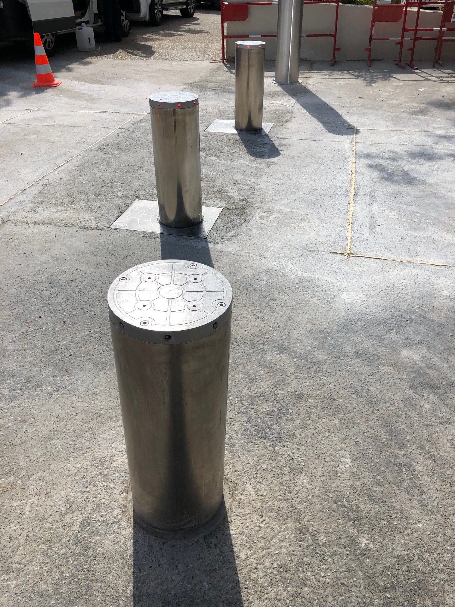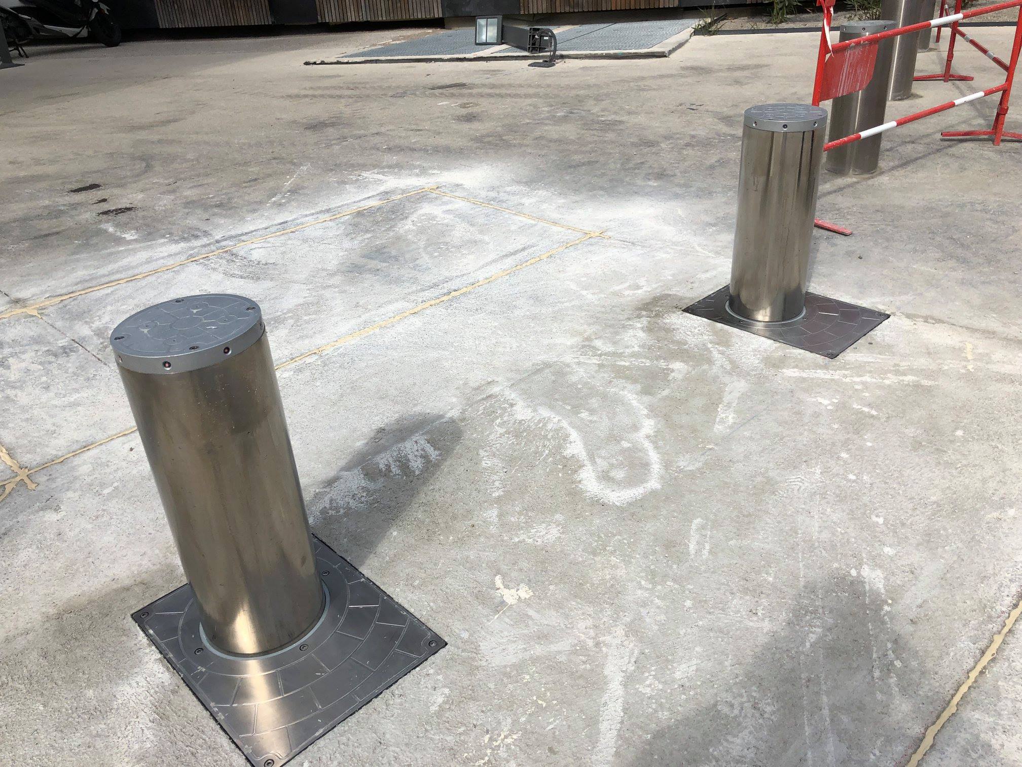 Installation de deux bornes escamotables Antivandale 600 mm et trois bornes fixes Frontier Pitts France, contrôle d’accès par télécommande avec création de deux boucles magnétiques de sécurité au sol et feux de signalisation – Chantier visible au Complexe Bureautique avenue Georges Méliès 34000 Montpelier